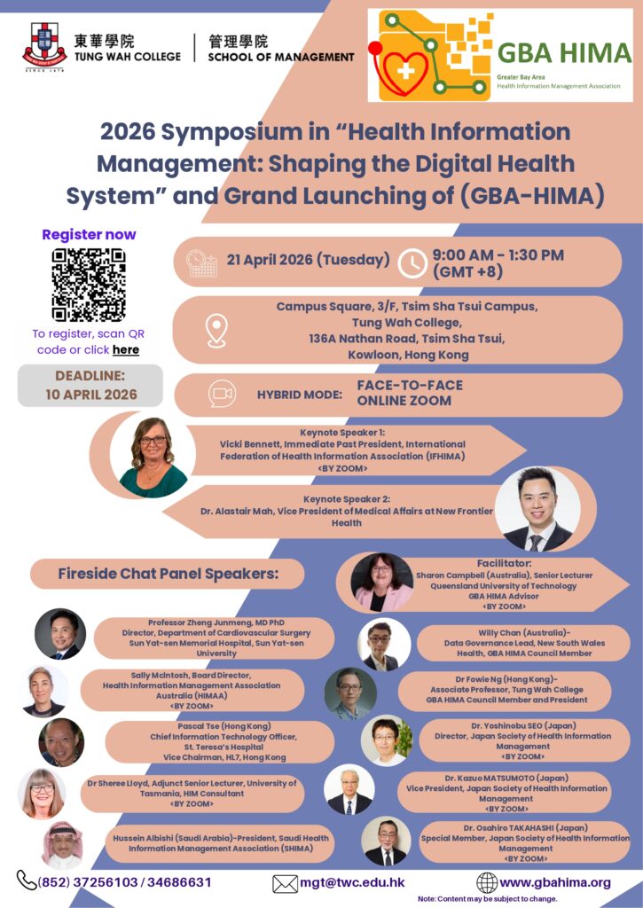2026 Symposium in “Health Information Management: Shaping the Digital Health System” and Grand Launching of (GBA-HIMA) will be held on 21 April 2026 (Tuesday) 9:00 AM – 1:30 PM (GMT +8).